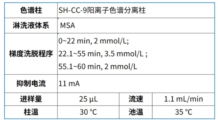 与IonPacTMCS17、IonPacTMCS16色谱柱实验对比,最终选用盛瀚 SH-CC-9 阳离子色谱柱