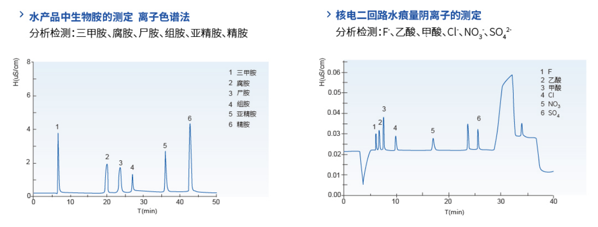 阴阳离子双通道系统,独立运行,同时检测;智能流路模块,一键流路切换,自动清洗,省时省力;国际领先的全系列色谱柱,满足各种组分离子的检测