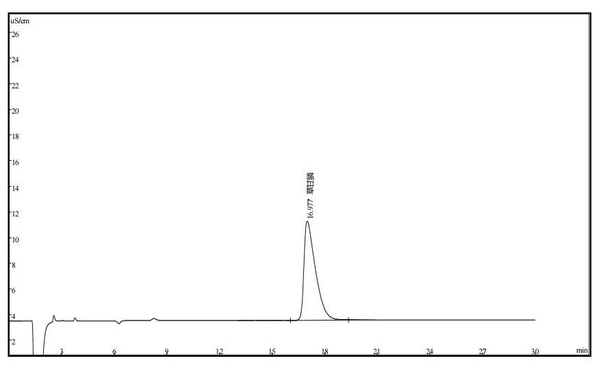 草甘膦化学名为 N-(膦酸甲基)甘氨酸,又名甘氨膦,农达等,属于氨基酸衍生物,是非常稳定的化合物,在水中溶解度为 1.2%,不溶于一般有机试剂。是一种广谱的除草剂,具有低毒,高效等优点。对人体和动物有一定的毒性,我国《生活饮用水卫生标准》(GB/T5749-2006)规定了卫生限值为 700μg/L,GB5750-2006《生活饮用水标准检验方法》标准规定检测方法有分光光度法,气相色谱法等,方法实验过程较繁琐。离子色谱法可简单的以阴离子交换分离,电导法检测,无需复杂的前处理操作。